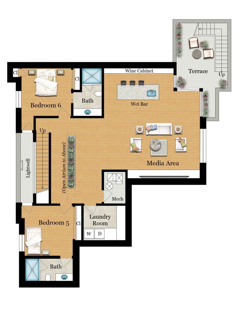 This level boasts soaring ceilings, two large lightwells and the unique atrium that originates here and extends up through all three levels providing an abundance of light and greenery. With large flexible space an entertaining kitchen and a wall of wine storage, this is the perfect place to watch movies and entertain your guests.