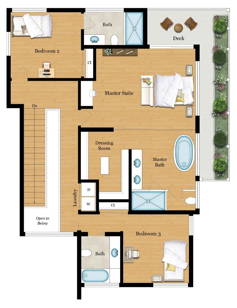 Luxurious, spacious and private, this master suite leaves nothing to be desired. Sliding glass doors lead to a wrap around balcony that overlooks the rear grounds and has built in-planters for added privacy and greenery to both the bedroom and bathroom. The master bathroom has radiant-heated tile floors, dual sink vanity with stone counters. A sumptuous soaking tub next to a picture window provides the view of your own private garden. A steam shower with built in seating bench and separate water closet. Sliding frosted glass doors can be open all the way or closed for privacy. The master closet dressing area is large and well appointed with an abundance of closet space.